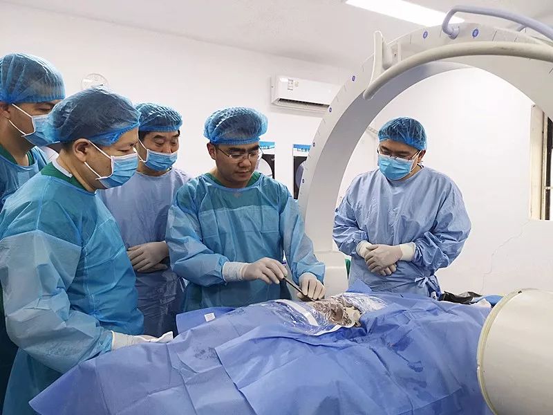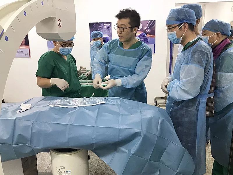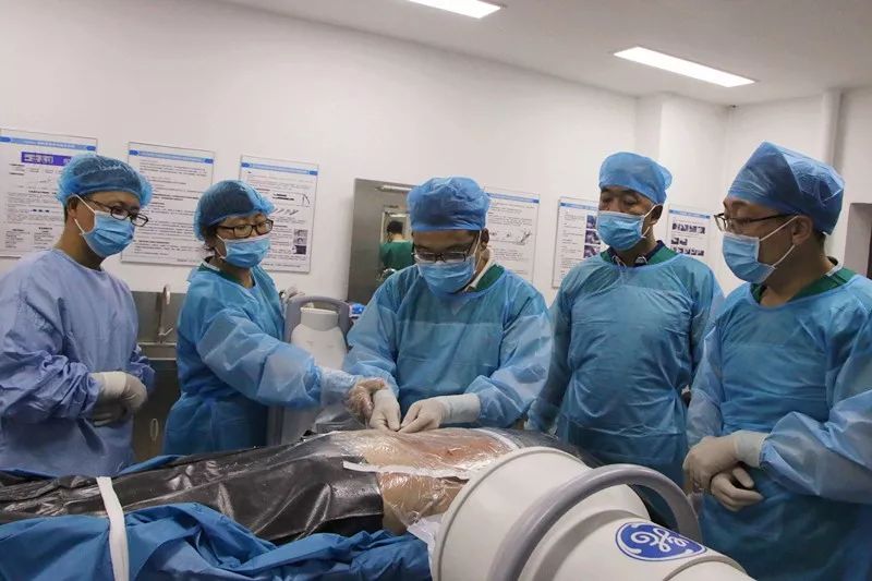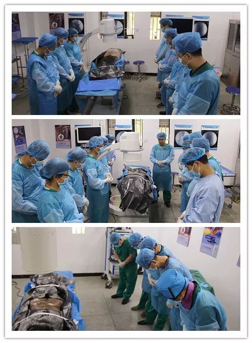 在培训现场,2台C臂、铅衣、2套TESSYS Isee和Delta手术器械,设备准备完善,每组四人轮流在实体标本上进行操作,完全模拟手术操作,每个学员都有充足的动手操作机会,使他们掌握穿刺技术、定位及镜下基本操作。